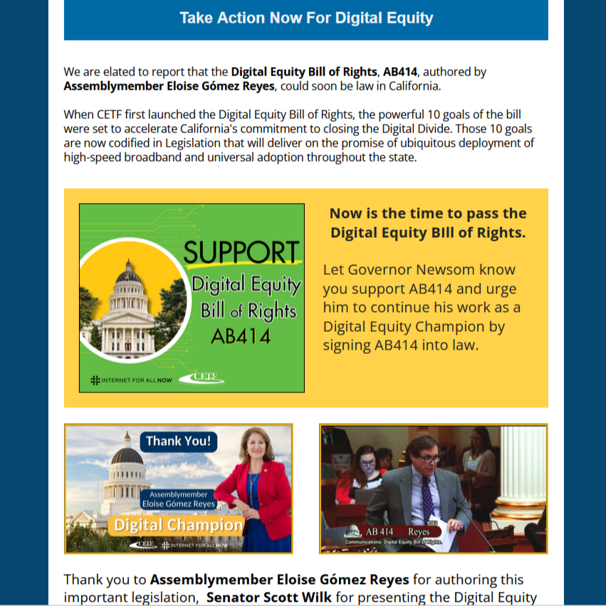 The California Emerging Technology Fund is pleased to announce that Governor Newsom has signed the Digital Equity Bill of Rights (AB414) into law! CETF wants to take a moment to thank the Governor, Legislators, and more than 5,000 organizations and individuals who have endorsed and mobilized for the passage of […]