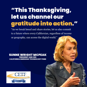 Dear Digital Equity Champions: Thank you for your dedication to transforming lives through your support of the California Emerging Technology Fund (CETF). This message is a reminder to consider donating to the CETF Digital Equity Fund to “Give the Gift of Connectivity” this Giving Tuesday, […]